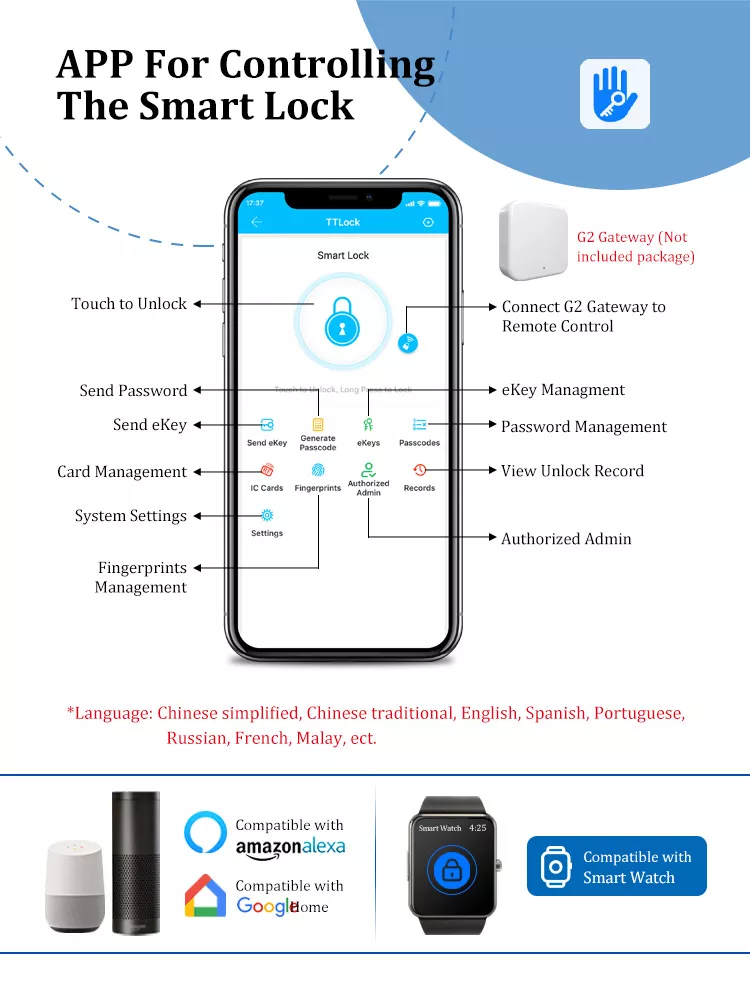 Truy cập TTlock APP, Mở khóa bằng vân tay, Mã, Thẻ, Mở khóa bằng phím cơ;