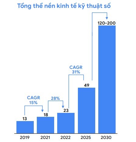 Đóng góp chính cho kinh tế số Việt Nam là thương mại điện tử, với giá trị dự kiến đạt 14 tỷ USD, tăng 26% so với năm trước. Dịch vụ nghe nhìn trực tuyến đạt 4,3 tỷ USD, còn lại các ngành như vận tải và giao đồ ăn, du lịch trực tuyến lần lượt đạt 3 tỷ USD và 2 tỷ USD tại Việt Nam trong năm. Dự báo đến 2025, kinh tế số Việt Nam sẽ đạt 49 tỷ USD, với mức tăng trưởng hàng năm 31%.